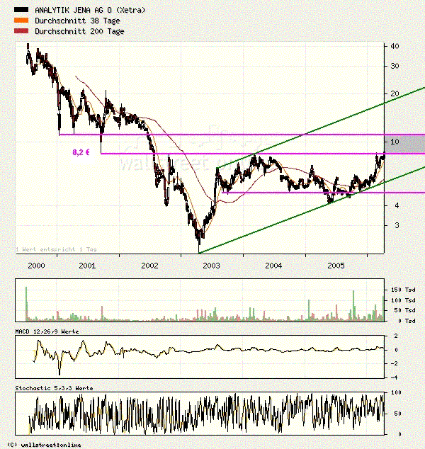 Rückblick: Seit März 2003 korrigierte die ANALYTIK JENA Aktie in einer riesigen, bullischen Flagge als Fortsetzungsformation im Aufwärtstrend. Am 08.02.2006 gelang schließlich der Anstieg über die Oberkante der Bullenflagge, womit ein mittelfristiges Kaufsignal generiert wurde. Die anschließende Reaktion war dann idealtypisch: Die Aktie vollzog eine direkte Rallye ans erste Kursziel bei 8,38 Euro, wo sie heftig nach unten hin abprallte. Nach einer Zwischenkorrektur bis 6,81 Euro zog die Aktie wieder deutlich an und pendelte in den letzten Wochen knapp unterhalb des Horizontalwiderstandes bei 8! ,38 Euro seitwärts. Heute springt die Aktie deutlich nach oben attackiert wieder die 8,38 Euro Marke als kurzfristigen BUY Trigger.