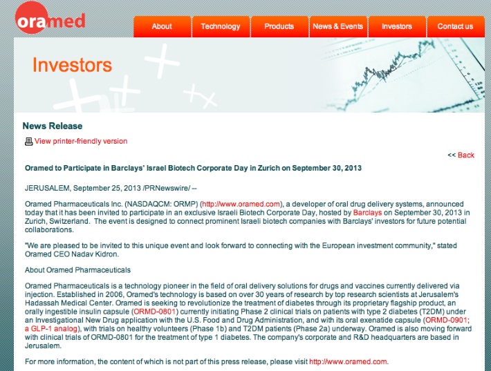 Oramed Pharmaceuticals is a technology Pioneer in the field of oral delivery solutions for drugs and vaccines currently delivered via injection. Established in 2006, Oramed's technology is based on over 25 years of research by top research scientists at Jerusalem's Hadassah Medical Center. Oramed is seeking to revolutionize the treatment of diabetes through its patented flagship product, an orally ingestible insulin capsule currently approaching FDA-approved Phase 2 clinical trials, and with its GLP-1 analog capsule, currently approaching Phase 1b/2a trials, the results of which are expected by the end of the calendar year. The company's corporate and R&D headquarters are based in Jerusalem.
