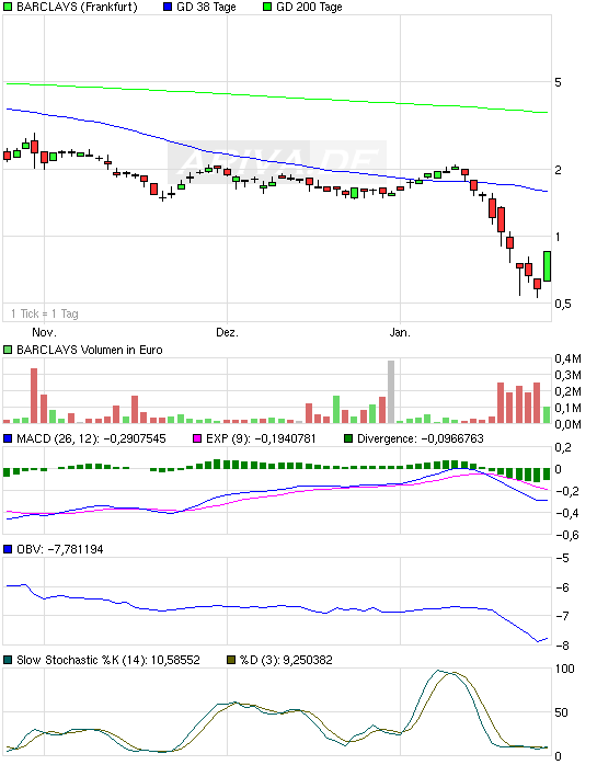 Barclays ist momentan in meinen Augen ein Kauf, auch noch zu Kursen um und über einem EUR. Das ist meine persönliche Ansicht und soll keineswegs jemanden zum Kaufen veranlassen. Jeder schwimmt hier auf eigenes Risiko im Ozean und hofft auf die nächste "big wave", die ihn in den rettenden Hafen spülen wird. Am Ende ist aber jeder auf sich selbst gestellt und "paddelt" für sich allein. Hoffe, jeder weiß das und handelt entsprechend.