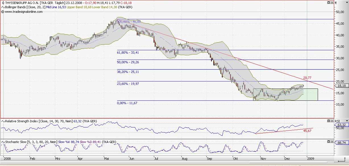 Überrascht hat mich der Verfallstag gestern, zunächst enormer Verlust von zeitweise über % Prozent und zum Schluss fast im Plus, auch bei L und S ist die Aktie heute über dem Schlusskurs. Überaschen tut mich dies, weil zum Mittag hin kaum noch Käufer da waren, die Aktie pendelte vor sich hin und zog kaum mit wenn es nach oben ging, aber dann brach die Aktie den Widerstand bei 17,10 Euro und schoß regelrecht nach oben. Seltsamfinde ich das, wirklich ungewöhnlich, denn normalerweise steigt die Thyssen Aktie zum Nachmittag hin nicht so stark an, läuft meist eher seitwerts. Zumindest stehen wir über 17 Euro, was bullisch zu werten ist, aber man soll sich nicht zu früh denken das schlimmste sei vorbei. Erst wenn wir in den nächsten Tagen weiter steigen kann man aufatmen, aber aucch dann bleibt aufgrund der geringen Umsätze die Lage ungewiss. Auh komisch, das sich Thyssen so stark von dem restlichen Stahlsektor abkoppeln konnte, während Salzgitter und Arcelor eher seitwerts laufen steigt Thyssen immer weiter. Schwierig einzuschätzen.
