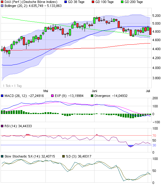 Morgen und Montag wird es spannend ob die 4650 bis 4600 ( unteres Bollingerband und 200 Tagelinie) hält. Wenn diese Unterstützung hält kann es durchaus nochmal über 4800 gehen im Juli.