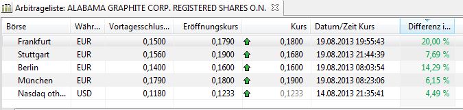 Die Aktie von Alabama Graphite (WKN A1J35M) konnte sich in den vergangenen Tagen außerordentlich gut entwickeln. Nach Bekanntgabe der geplanten Akquisition von Grafitprojekten, welche sich in unmittelbarer Nachbarschaft zu der Grafitentdeckung der kanadischen Zenyatta befinden, scheinen vermehrt Anleger auf die Aktie aufmerksam zu werden. Das wundert unsere Experten nicht, schließlich hat sich der Aktienkurs von Zenyatta in den vergangenen 12 Monaten im Hoch rund verdreißigfacht. Vor einem Jahr noch notierte die Aktie bei 17 Cents, gestern ging das Papier mit einem Schlusskurs von 4,00 Dollar (CAD) aus dem Handel der kanadischen Börse, das Jahreshoch liegt bereits bei 5,00 Dollar (CAD). Die Aktie von Alabama Graphite notiert an der kanadischen Börse bei aktuell 21 Cents.