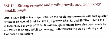 Ich finde auf der Internetseite sind alle Informationen die man braucht. In welchen Bereichen die Firma tätig ist und vor allem regelmäßige Quartalszahlen und Jahresabschlüsse. Müllverarbeitung ist auf der ganzen Welt ein Thema. Scanship stellt daraus noch Energy her zur CO2 Einsparung. Gerade auf Schiffen und in der Rückgewinnungen in der Wasserversorgung liegt die Zukunft.