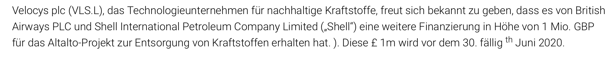 Velocys plc (VLS.L), das Technologieunternehmen für nachhaltige Kraftstoffe, freut sich bekannt zu geben, dass es von British Airways PLC und Shell International Petroleum Company Limited („Shell“) eine weitere Finanzierung in Höhe von 1 Mio. GBP für das Altalto-Projekt zur Entsorgung von Kraftstoffen erhalten hat. ). Diese 1 Mio. GBP werden vor dem 30. Juni 2020 fällig.