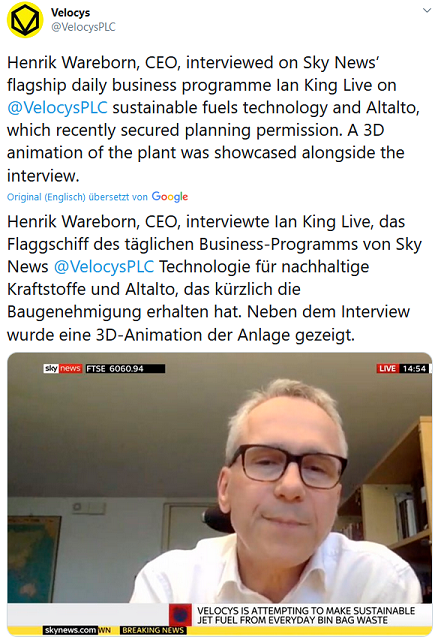 "Es ist eine fantastische Nachricht, dass der Planungsausschuss unser Abfall-zu-Strahl-Brennstoff-Projekt genehmigt hat, das eine Premiere für Großbritannien sein wird. Nachhaltige Flugkraftstoffe sind für die Dekarbonisierung dieses herausfordernden Sektors und das Erreichen von Netto-Null-Emissionen bis 2050 unerlässlich. Deshalb fordert Velocys die Regierung auf, die Politik zwischen den Ministerien zu koordinieren, um uns bei der Finanzierung einer Flotte von weltweit führenden nachhaltigen Flugkraftstoffanlagen im Vereinigten Königreich zu unterstützen".