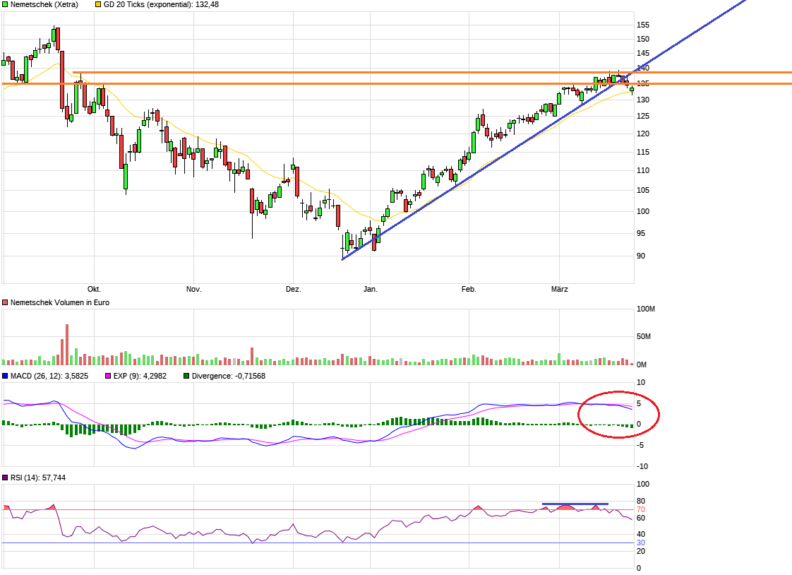 Nemetschek­ ist technisch eine Trendaktie­, die fundamenta­l überteuert­ ist. Da geht's darum, dass Trends gebrochen werden und dann weit tiefere Kurse realistisc­h werden. Fundamenta­l ist Nemetschek­ sicherlich­ eher bei 80-85 € fair bewertet. Und da kommen wir auch wieder hin sobald der Markt im allgemeine­n etwas stärker schwächelt­.