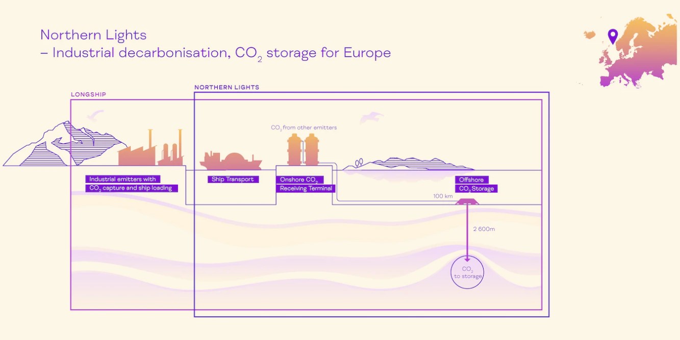 In Øygarden (Northern Lights Carbon Capture Plant Site) ist das Terminal mit Zwischenlagerung, die dauerhafte Lagerung ist 100 km vor der Küste von Øygarden.