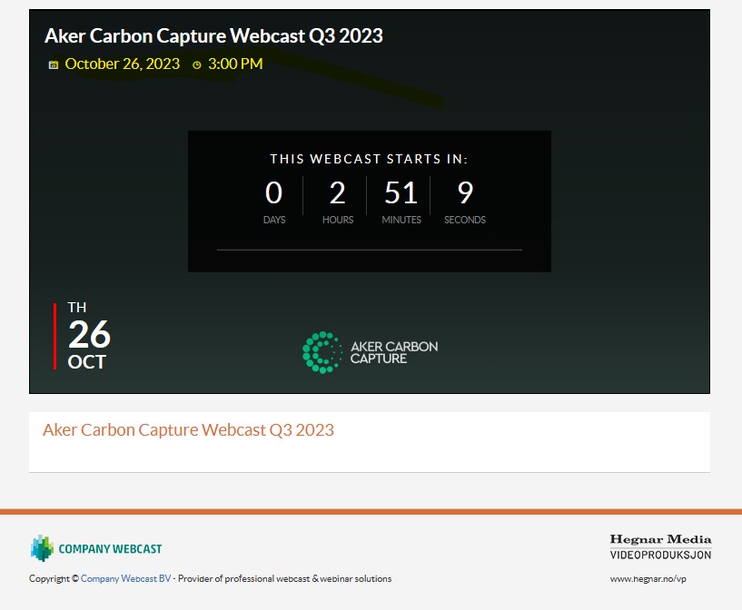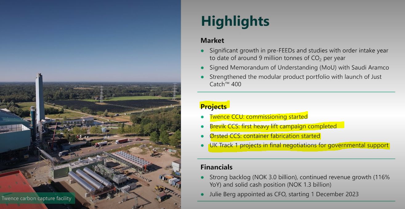 Anzumerken ist, dass die angekündigte Machbarkeitsstudie eines großen Players (im Bereich der Abfallverwertung) aus Frankreich zum Frontrunner für Europa werden könnte, CEO Fagerland hielt es für erwähnenswert, dass das Unternehmen in der "Carbon Capture World" anerkannt ist und viele Anfragen von internationalen Kunden insbesondere aus der USA erhält.