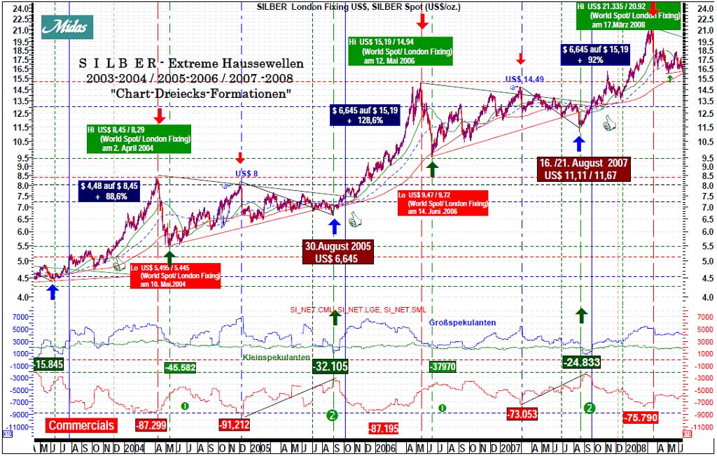 ""Die Eigentümlichkeiten von Chart-Triangle-Formationen im Vorfeld von exzessiven Haussewellen war Hauptthema der Goldbrief-Ausgabe 6/2015 (vom 14. Juli 2015). Dabei haben wir anhand von Silbercharts aufgezeigt, dass der Anstieg des Silberpreises in der Zeitspanne 2003 bis 2011 von etwa 4 US$ auf knapp 50 US$ lediglich durch vier gewaltige, relativ kurze Kursexzesse erfolgt ist. Diese extremen Kursschübe waren immer nur auf etwa 7 bis 9 Monate beschränkt. Sie haben meist im August (!) eingesetzt und bis zum März, April oder Mai des darauffolgenden Jahres angehalten. Vor all diesen Kursexzessen waren in den Charts immer "Dreiecksformationen" bezeichnend!