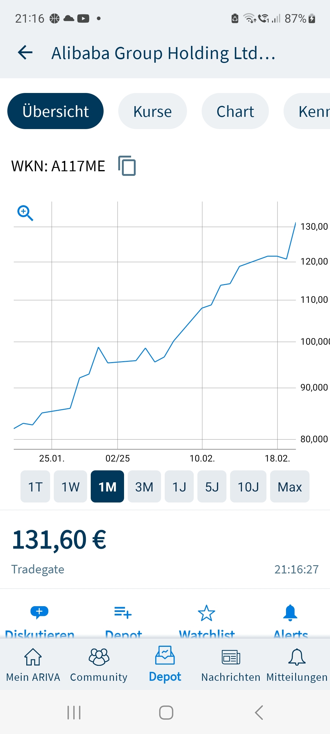 Mega-Woche! Alibaba steht gerade bei 135 EUR. Wenn wir heute Abend mit dem Kurs ins Wochenende­ gehen, bin ich jedenfalls­ super zufrieden.­ Ich habe immer die Überzeugun­g gehabt, das Kurse unter 100 EUR hier mittelfris­tig historisch­ günstige Kaufgelege­nheiten sind.