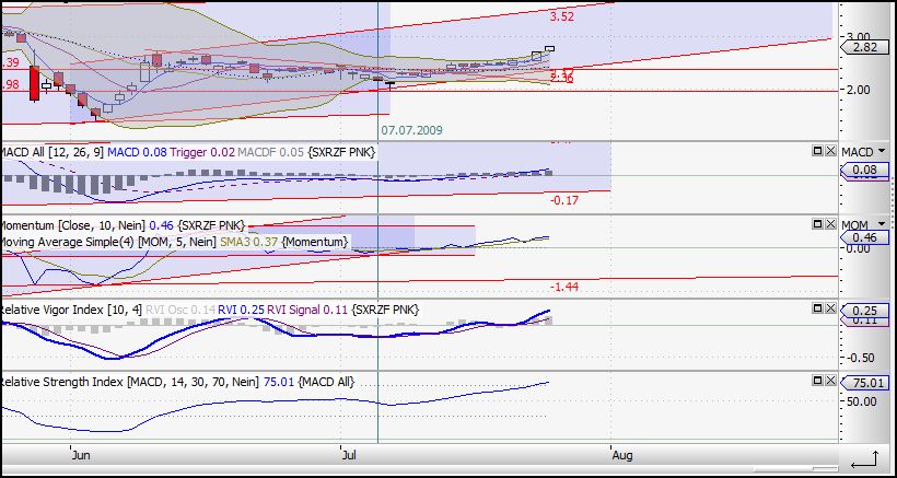 auch, wenn der RSi eine überkauft-Lage anzeigt, dürfte es m.E. weiter nach oben gehen, da mächtig Druck dahinter ist (s. Momentum). Auch das Bollingerband läßt zunächst vermuten, dass Uranium heute zurückfallen sollte. Aber ich glaube dies höchstpersönlich nicht wegen des zuvor beschriebenen Drucks ! Abwarten. Wenns runter gehen sollte handelt es sich nur um eine vorrübergehende Korrektur.