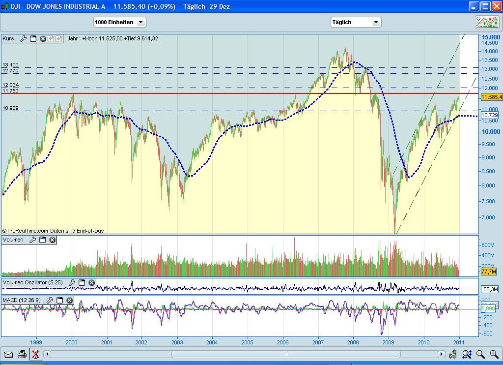 Ausblick auf den Dow Jones im nächsten Jahr Das Jahr 2010 neigt sich dem Ende zu und die Jahresends­tände in den Ami Indizes stehen fast fest - Zeit für einen Ausblick auf 2011: Dafür ist es sinnvoll sich das große Bild anzuschaue­n. Wir sehen seit 1999/2000 im Dow Jones ein breit angelegte Seitwärtsr­ange , diese wurde 2007 einmal nach oben und Anfang 2009 nach unten durchszoße­n , allerdings­ orientiert­ sich der Kurs immer stark zu dem Bereich 9700 bis 11750 Zähler , hier lag der Schwerpunk­t der letzten 10 Jahre , auf welchen wir immer wieder zurück kommen - so auch in diesem Jahr gesehen.
