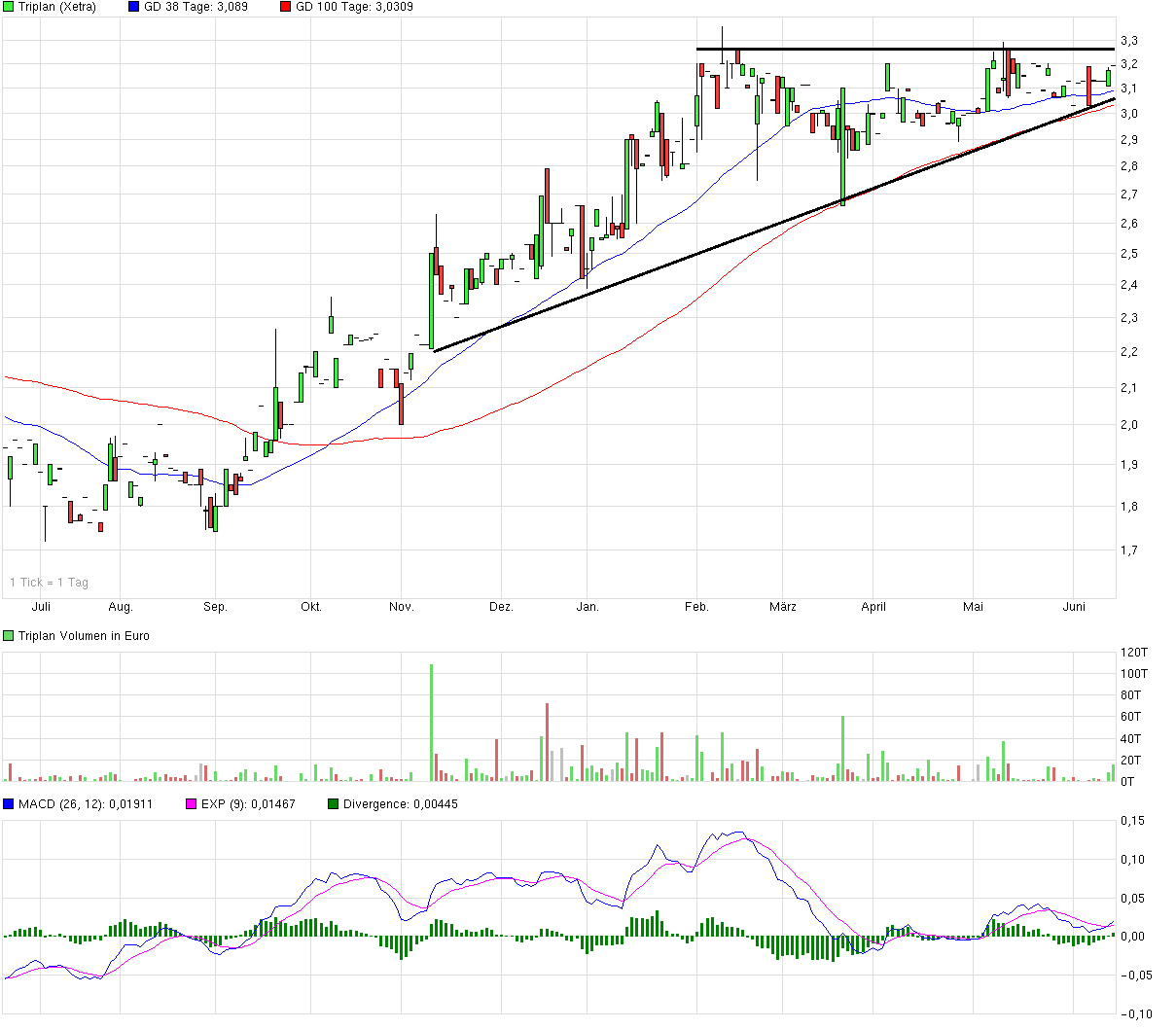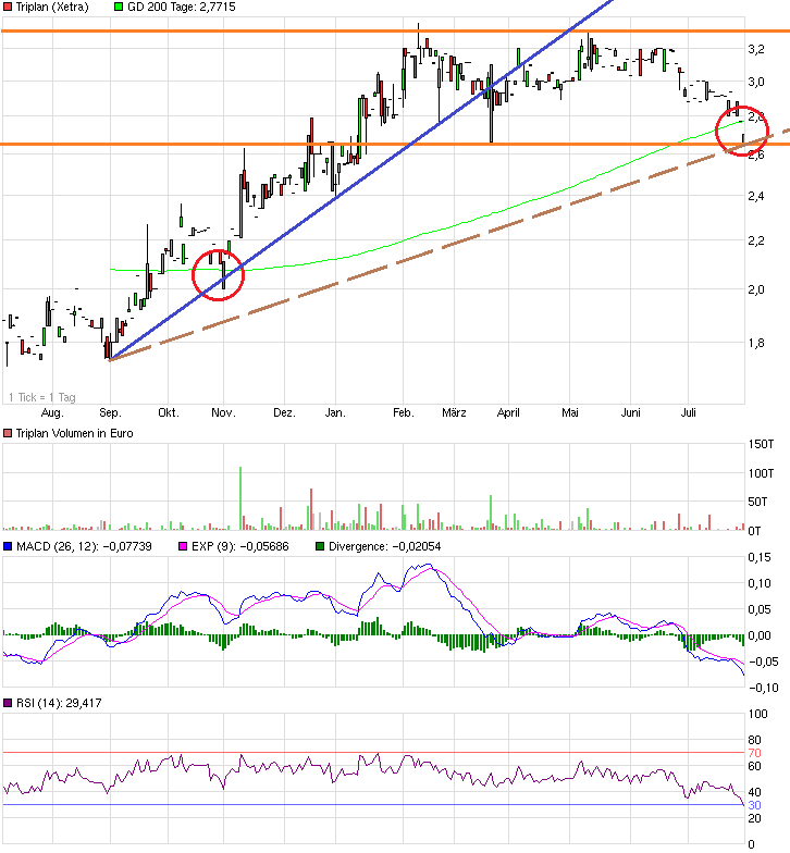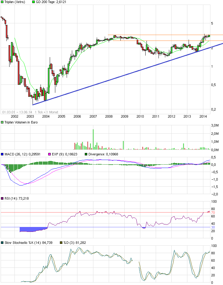Der Kurs ist ja aufgrund der starken Unterbewertung und der guten 2013er Zahlen von 1,75 auf 3,30 € hochgelaufen. Jetzt konsolidiert er halt seitwärts bis klar ist, ob der Vorstand seine Jahresziele zumindest annähernd erreicht. Da scheint sich der Markt nach den ersten zwei Quartalen noch nicht ganz sicher zu sein. Wenn das aber im November doch geschafft wird, dürfte der Kurs in die Höhe schießen. Bis dahin muss man sich halt gedulden. Das Gute ist, selbst bei einer Verfehlung der Umsatzprognose (statt 50 Mio nur 48-49 Mio) ist Triplan im Grunde ein Kauf. Nur bei einer noch klareren Verfehlung dürfte der Kurs wohl weiter seitwärts stagnieren.