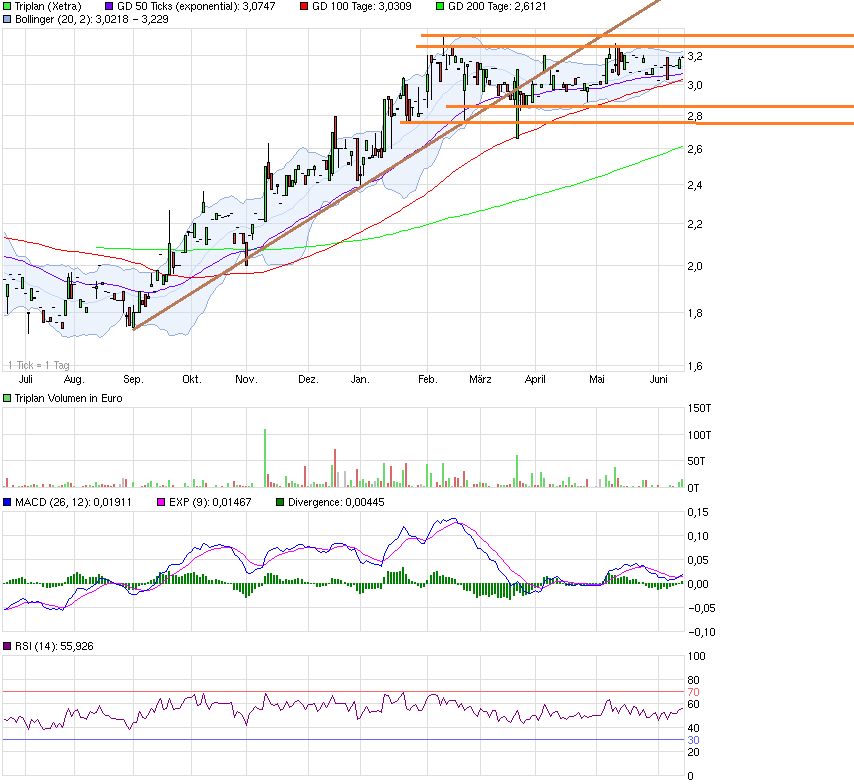 der Kurs halt kurzfristig zwischen 3,00-3,05 und 3,25-3,30 € gefangen ist. Bei 3,00-3,05 ist man ganz gut durch untere Bollinger und 38+100DS unterstützt. Sollten die Gesamtmärkte richtig abstürzen, sind auch nochmal 2,8 € denkbar, wo ich aber fett nachkaufen würde.
