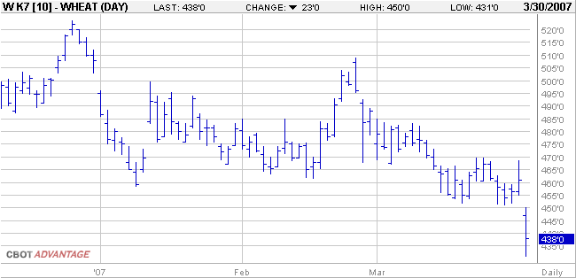 "Spillover selling from the CBOT corn market continues to keep U.S. wheat futures sharply lower, traders say. Corn is locked at limit-down after the USDA released higherthan-expected estimates on U.S. prospective plantings, analysts say. Funds have sold an estimated 4,000 wheat contracts at CBOT. CBOT May wheat is down 21 1/4 cents at $4.39 3/4."