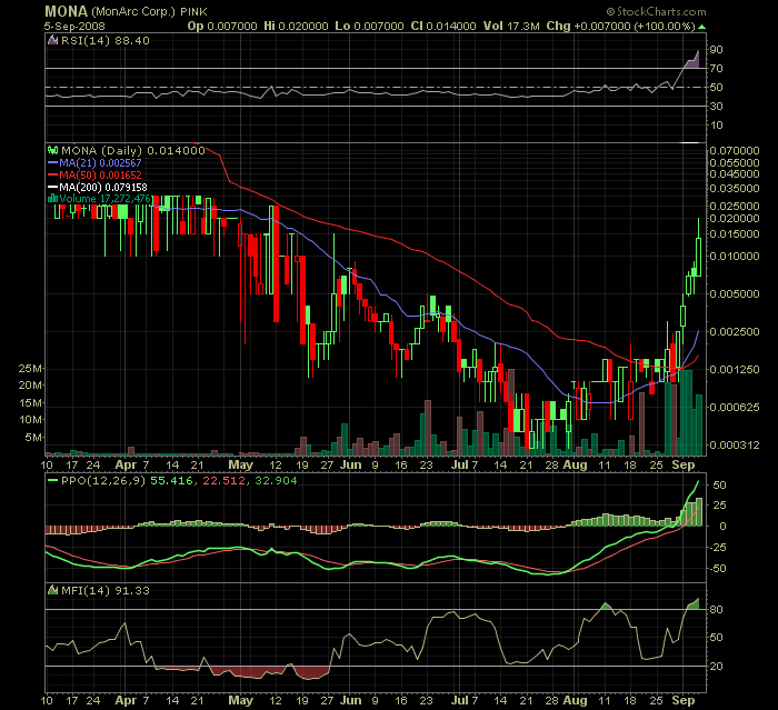 Bitte nicht unseriös werden! Die Aktie hat bereits einen Anstieg von rountabout 1000% in den letzten Tagen hinter sich! Das sollte man nicht verschweigen, wenn man über Monarc diskutiert!!!