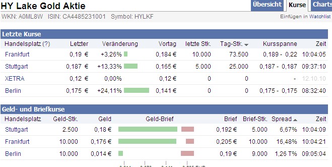 ich habs nicht mehr ausgehalten... wie kann es eigentlich sein das ich seit jahresanfang mich nur über hyl ärgere und sie heute vormittag!!! (ja die 0,155 in frankfurt zwischendurch waren von mir) mit einigem doch noch zufriedenstellendem gewinn veräußert habe und schon tritt mir das schicksal wieder in den hintern und verdirbt mir die freude... ich hab nicht die geduld mir monate anzuhören demnächst, bald, nicht mehr lange. das macht unglaubwürdig. naja, warte ich mal bis morgen noch n paar gewinnmitnahmen ab und steig dann wieder ein. ist ja heut auch schon wieder gut runtergekommen. man man mit hyl hat man kein leichtes leben... sollte angler werden, da lernt man geduld.