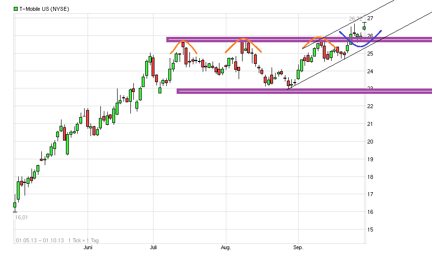 chrunch time: Sieht so aus, dass die 30,00 $ bald erreicht werden, oder? Das Gute dabei, noch vor dem 05.11./07.11.13. Heute wohl auch die Ankündigung von AT & T, also der Markt ist in Aufruhr (steigende Kurse bei Vodafone). Wenn jetzt noch die News in den USA bei TMUS Inc. stimmen, dann wird's wohl auch hier mehr mit den Kursen, sowohl in Frankfurt, als auch an der NYSE. Leider ist das Papier in keinem Index, weil der dt. Einfluss zu hoch ist, obschon 4. größtes Unternehmen seiner Art in den USA. Auch unsere Verlage haben das noch nicht realisiert, die das Papier totschweigen. Allenfalls findet man mal einen Kommentar mit Bezug auf die Dt. Telekom AG; das reicht aber m.E. keinesfalls. Kommt jetzt drauf an, wie man das in den USA sieht, etwa durch den Nachrichtensender CNBC oder Bloomberg. Da sah man ja auch schon Einiges - aber immer nur Andeutungen, wie in dem Interessensfall mit Dish Network und der Empfehlung von BACML, aber auch hinsichtlich der enormen Kurssteigerungen.