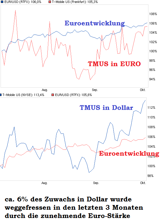 Übrigens hatte T-Mobile US jüngste eine Investoren-Konferrenz aufgesucht. Habe mir mal das zehnseitige Transcript reingezogen : http://phx.corporate-ir.net/...NoaWxkSUQ9MjA1MTU0fFR5cGU9MQ==&t=1 => Transcript: T-Mobile US, Inc. Goldman Sachs 22nd Annual Communacopia Conference. September 25, 2013 8:50 A.M. ET . Stehen doch einige interessante Aussagen drinnen über den Stand der Dinge bei der Integration der beiden Firmen und wie es weiter geht mit der Strategie. Der CEO Legere war leider nicht da wg. wetterbedingten Problemen bei der Anreise. Aber dafür war CFO Carter, CTO Ray und, CMO Sievert, CMO vor Ort und haben auch ordentlich die Sache dargestellt. Also die klingen doch sehr optimistisch, daß die im 2.Q eingesetzte Wende sich auch künftig weiter so gut fortsetzen wird. Mit dem gezielten Ausbau der Netze, speziell LTE, und den einfachen neuen Vertragsstrukturen (siehe JUMP bzw. Uncarrier 2.0), will man auf der einen Seite die Churnrate möglichst niedrig halten, auf der anderen Seite weiter Kunden "wildern" bei AT&T und den anderen Playern ohne dabei aber weiter Preisnachlässe geben zu müssen. O.K. klar, bei solchen Konferrenzen will sich natürlich jeder glänzend darstellen. Aber es klang schon recht überzeugend was da gesagt wurde bei den Q&A. Von daher mal abwarten, ob man jetzt schon bis zu den Q.3 Zahlen beim TMUS Kurs eine Schippe drauflegen wird oder ob man doch erstmal abwartet, ob sich der geäußerte Optimismus auch hinreichend schon in den Q.3 Zahlen niedergeschlagen hat. Die Übernahmephantasie ist sicherlich nur ein kleiner Teil der momentan den Kurs weiter treiben könnte. Aber zumindest sieht man ja in der Branche die letzten 12 Monate deutliche Konsolidierungvorgänge bzw. Beteiligungsänderungen bei den anderen Playern. Von daher ist durchaus T-Mobile US ein Objekt was Interessenten anlocken kann. Im Kern geht es jetzt aber erstmal darum sich selber durch verbesserte fundamentale Entwicklungen auf ein höheres Kursniveau zu bringen. Und da scheint ja doch etwas jetzt in Gang zu kommen. Ein Knackpunkt bei dem Investment ist natürlich, daß es in US-Dollar stattfindet. Und der Dollar ist ja in den letzten Monaten wieder deutlich schwächer geworden gegenüber dem Euro. Somit ist ein gutes Stück der US Kursanstiege der letzten Zeit für Euroraum-Investoren nicht ganz angekommen. Daher muß man sich schon fragen wie geht es weiter mit dem Dollar. Wenn die Amis nicht die Kurve bekommen bis zum 18.10., dann könnte der Dollar nochmal ein Stück nachgeben. Ich würde vorsichtigen Leuten die neu einsteigen wollen raten mit einem Investment vielleicht noch etwas zu warten bis klarer wird was €/$ betrifft. Bin in der letzten Zeit auch mehr bei der DTE investmentmäßig aktiv gewesen, da ich dort alle Anstiege 1:1 in Euro habe. Sollte sich der Knoten bei der US Politik lösen, dann würde ich aber bei TMUS auch wieder zugreifen, vorausgesetzt man kippt nicht wieder zurück in die Seitwärtsschaukel der letzten Monate ( =24/26$) .