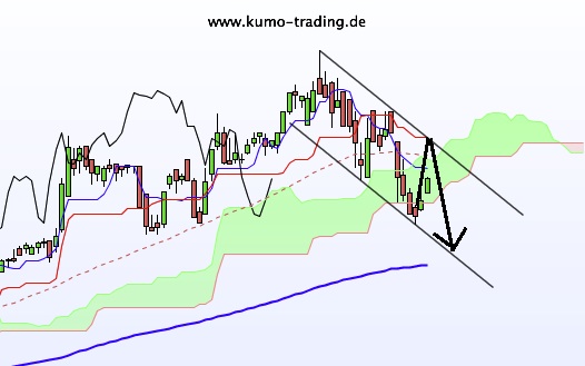 Der Ichimoku-Chart hat mit Kumobreak nach unten den Abwärtstrend bestätigt. Nach einem Kumobreak erfolgt sehr häufig ein Rücklauf ans Ausbruchsniveau bzw Kijun Sen (rote Linie). Das haben wir heute im Tagesverlauf gesehen. Ein Schließen unterhalb von Tenkan Sen (blaue Linie) würde dieses Theorie bestätigen.