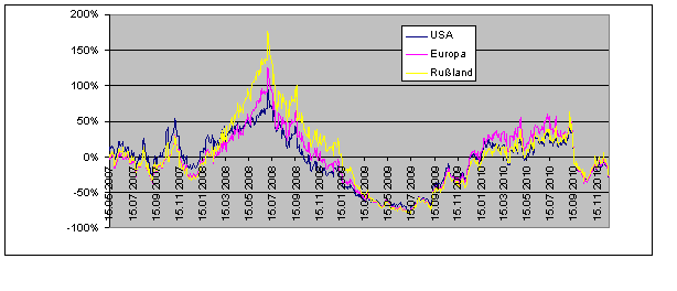 Hier nochmal die prozentualle Veränderun­g des Gaspreises­ zum Vorjahr in verschiede­nen Regionen, wie man sieht macht das den Kohl nicht fett, daher denke ich auch das sich die Produktion­szuwachsra­ten in den USA und Europa nicht sonderlich­ von Rußland unterschei­den.