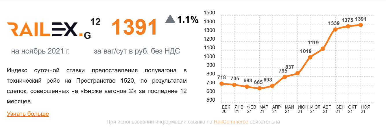 Der Frachtumschlag der RZD unter Berücksichtigung des Leerwagentransports (der den Umsatz des Unternehmens ausmacht) stieg im Oktober 2021 gegenüber dem Vorjahresmonat 2020 um 2,8% auf 290,8 Milliarden Tonnenkilometer......