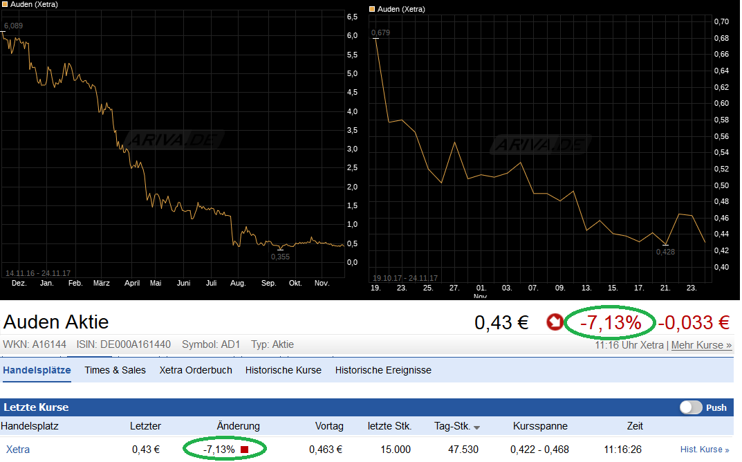 Keine Ahnung, warum man die Nachricht negativ interpretieren sollte. Der Handel in dem Wert ist halt mehr oder weniger eingeschlaffen und es bestehen auch gewisse Risiken (---> www.ariva.de/forum/auden-ag-die-mega-chance-550761?page=3#jump23588695). Und die bekannten Penny-Zocker spielen zur Zeit lieber totalen Schrott (wie Inso- oder Mantelspekulationen).