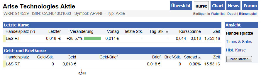 Wenn ihr aber mal richtig hingeschaut hättet (Brille?) ,dann hättet ihr hier festgestellt ,dass nur gerade mal "15 €" zum dem" wahnwitzigen Anstieg" auf die 0,018 führte (welch ein Volumen ), um solch ein vermeintliches Käuferinteresse hier vorzugauckeln ,dank dem L&S-Marketmaker.So naiv kann man doch nicht sein ,oder?Wie dumm muss man sein und das alles anzunehmen?Da ist es doch kein WUNDER das man in so eine Aktie wie Arise "hineinschlittert"...und nicht mehr herauskommt.