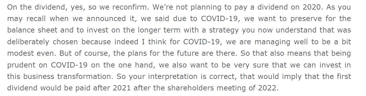 Marco Limite (Barclays): "...My third question is a quick one. If you can just confirm if you are not going to pay a dividend in 2020, so the next dividend payment will be in May 2022..."