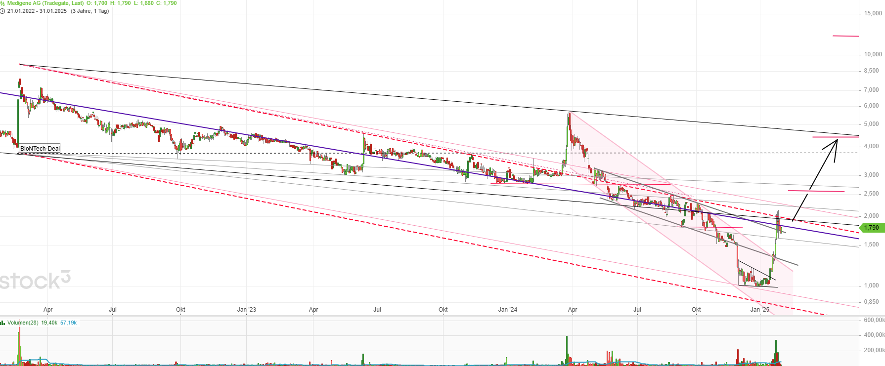 "... Der Bezugspreis wurde auf EUR 1,70 festgelegt und entspricht 95% des Durchschnitts des jeweiligen volumengewichteten Durchschnittskurses der Medigene-Aktie am Handelsplatz Xetra an jedem der fünf Handelstage, die auf die Veröffentlichung der Ad-hoc Mitteilung am 24. Januar 2025 folgten. ..."