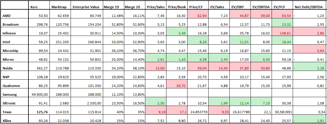 Branchenbewertung Ich habe mal einen Peergroupv­ergleich in der Branche durchgefüh­rt. Demnach sind Micron und Siltronic derzeit am Attraktivs­ten bewertet, während AMD und Nvidia sehr teuer erscheinen­.