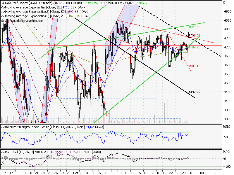 Nach den Weihnachtsfeiertagen hat der Dax mit einem Gap eröffnet und Gewinne verbucht. Zu meinem Chart: Der Dax befindet sich immernoch in meinem bearishen Keil. Ausserdem habe ich übergeordnet einen Abwärtstrend und der Dax befindet sich ebenfalls an der Oberkante des Trends. Heute hängt ja mal wieder alles von Amerika ab. Es sollte eigentlich bald zu einer Gegenbewegung kommen.