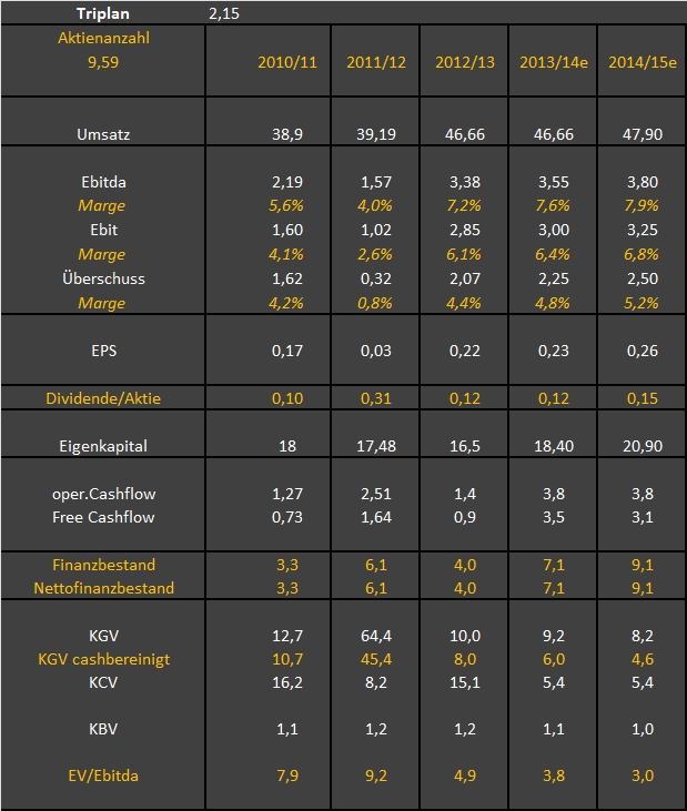Aber Triplan ist jetzt nur noch mit 19 Mio € bewertet. EnterpriseValue nach Abzug des nettocash bei 11,5-12,0 Mio €. Also EV/Ebit bei 3,8 und EV/Ebitda bei 3,3