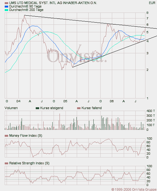 Kurz-Kommentierung: Die UMS Aktie erreichte am 30.11.2005 ein Hoch bei 6,50 und ging danach in einer deutliche Korrektur, welche die Aktie bist fast auf die Unterstützung bei 3,35 Euro zurückführte. Am etwas darüber liegenden Aufwärtstrend seit Dezember 2004 stabilisierte sich die Aktie. Vor 3 Wochen gelang ihr der Ausbruch über den Widerstand bei 4,86 Euro. In den letzten beiden Woche behauptete sich die Aktie nicht nur darüber, sondern setzte sich auch nach oben ab. Solange die Aktie nun per Wochenschlusskurs über 4,86 Euro notiert, ist eine Aufwärtsbewegung bis zunächst 6,50 und später 7,59 Euro zu erwarten.