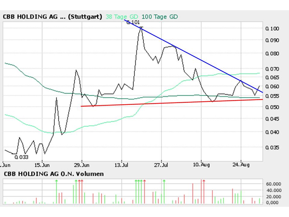 ist jetzt mal das sich ergebende Dreick bzw. der momentan vorherrschende "Downtrend" nach oben durchbrochen worden (wohlgemerkt, wenn's bis zum Handelsende so bleibt). Sollte als auch die 38 Tage Linie nach oben durchbrochen werden (die bei etwa 0,066 liegt) könnte es zumindest aus charttechnischer Sicht weiter nach oben gehen bis in einen Bereich von etwa 0,08 Cent...
