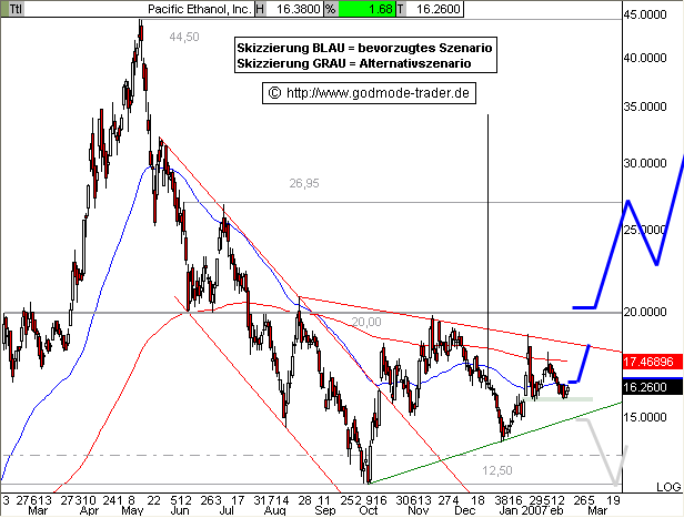 Rückblick: Die PACIFIC ETHANOL Aktie markierte im Mai 2006 das AllTimeHigh bei 44,50 $ korrigierte anschließend deutlich bis an das alte Ausbruchslevel bei 12,50 - 13,50 $, wo sie eine Trendwende nach oben hin vollzog und bis zum Widerstandsbereich bei 20,00 $ anstieg. Seit dem pendelt sie seitwärts, wobei sich die Handesspanne verengt. Das kurzfristige Chartbild ist jetzt wieder bullisch zu werten.