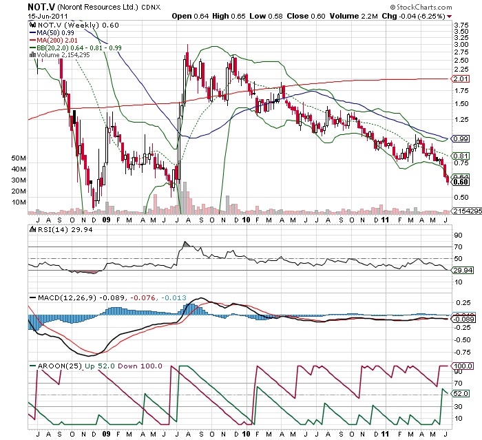 der Kurs, auch vernünftige Nachrichten aus der Firma fehlen. Ich kann nur denken, so blöd können die Chinesen doch nicht sein, dass sie genau vor dem Zusammenbruch und Ausverkauf (den der Marktpreis an die Wand zu malen scheint) eine Beteiligung eingegangen sind. Ich hielt den Einstieg von Baosteel natürlich für eine Art Ritterschlag: die glauben wirklich, dass Noront produzieren wird, und so. Wenn man den Chart anschaut ist aber klar dass es schlimmer kaum geht...