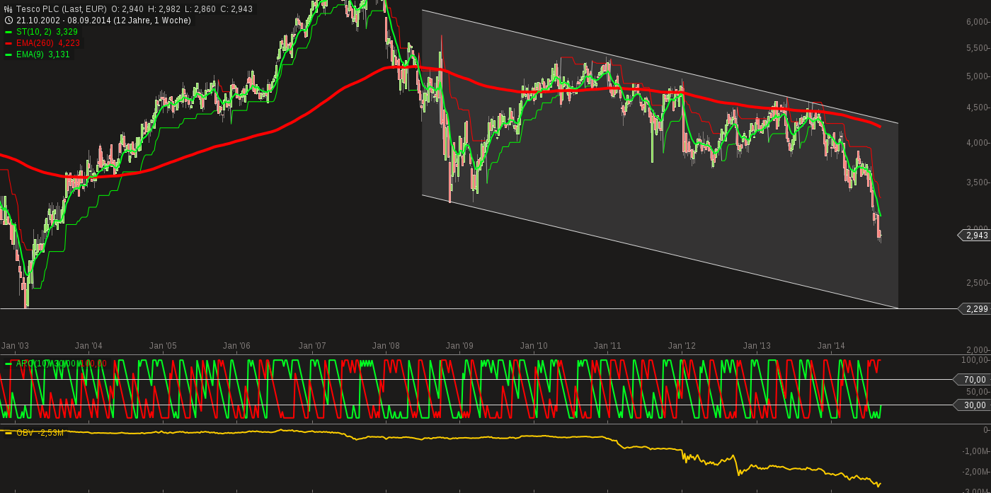 Nun hoffe ich, dass es kein Fehler war, zu diesem Zeitpunkt 2014 einzusteigen. Vor dem Abrutscher auf 2,90 € habe ich auch noch gezögert. Wir wissen ja: Ein Risiko gibt es immer - also auch bei Tesco. Deshalb versuche ich die Positionsgrößen entsprechend zu gestalten. Bei anderen Titeln habe ich zum Beispiel auch etwas zu früh gekauft. Aber man erwischt ja (fast) nie den richtigen Zeitpunkt zum Einstieg. Nach dem Absacker jedoch konnte ich mir ein Posting in diesem Forum nicht verkneifen, da wir diese Preise ja lange nicht sahen und ich Tesco für so interessant halte.