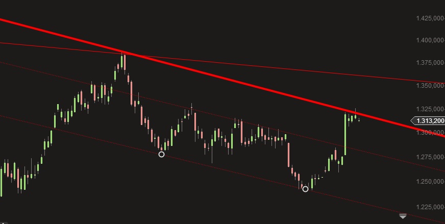 ShortM's Hinweis auf die Indexzahlen um 14.30 Uhr gestern Nachmittag, ist im Chart schön zu sehen. Das Tief stoppte bei 1.306$, bevor es 12 $ nach oben schoss. Seither stabilisiert es den Long-Train. Während ich das schreibe steigt es über 1.321 $. Die gestrichelte, rote, abfallende Linie ist eine Möglichkeit, als obere Begrenzung.