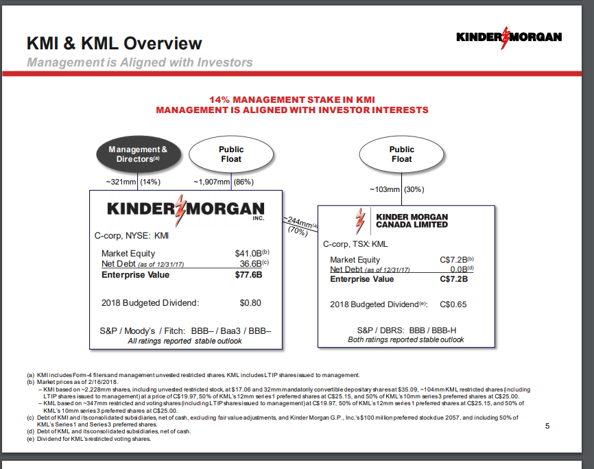 Für das Jahr 2018 plant KMI, Dividenden in Höhe von 0,80 US-Dollar pro Stammaktie und einen DCF von 4,57 Milliarden US-Dollar (2,05 US-Dollar pro Stammaktie) und ein bereinigtes EBITDA von rund 7,5 Milliarden US-Dollar auszuweisen. Die Ziele von DCF und Adjusted EBITDA sollen erreicht oder sogar übertroffen werden. KMI plant nun, im Jahr 2018 2,3 Milliarden Dollar in Wachstumsprojekte zu investieren (ohne Wachstumskapital, das voraussichtlich von KML finanziert wird), 100 Millionen Dollar aus dem Budget, die mit intern generiertem Cashflow finanziert werden, ohne Zugang zu den Kapitalmärkten zu benötigen. KMI erwartet außerdem, dass es seine geplante Leverage-Kennzahl des Verhältnisses von Nettoverschuldung zum bereinigten EBITDA zum Jahresende von etwa 5,1-fachen erreicht oder übertrifft.