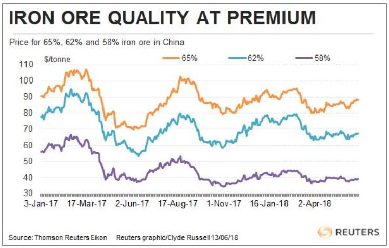 "The price of 65% grade Brazilian-origin iron ore had risen by a fifth since March to $96.80 a tonne on Thursday. Its premium over 62% grade iron-ore fines hit a record $29 this month."