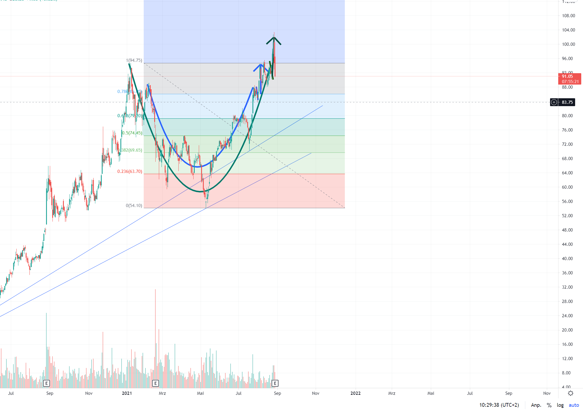 Die Doji deuten noch eine Verlängerung des Upmove an. Bei einer bullischen Fortführung würde ein Zurückkommen bei 84 – 85€ in die Bollinger Mitte und für die Auffüllung des Tassenpatterns ein Abknicken bei 87- 88€ in das untere Bollinger dazugehören.
