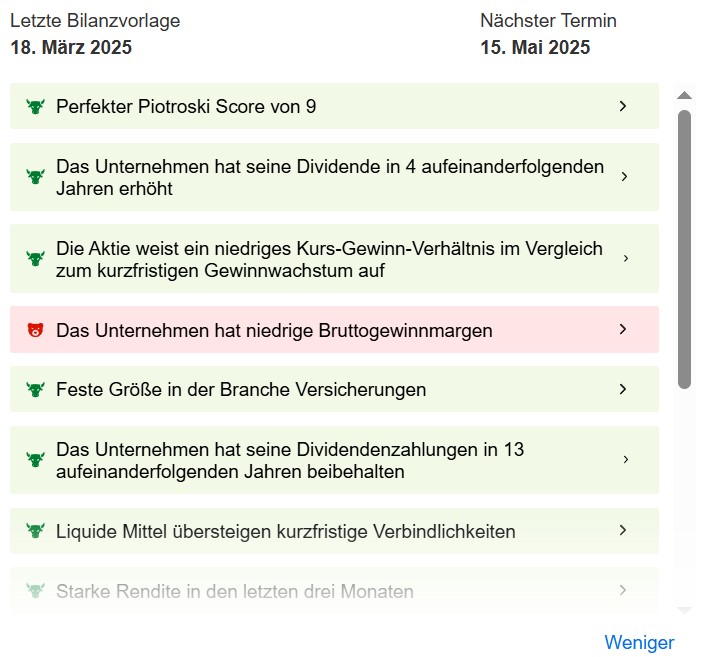 Mit einem perfekten Piotroski-Score von 9 zeigt Talanx eine hervorragende finanzielle Stärke. Zudem hat das Unternehmen in den letzten vier Jahren konsequent die Dividende erhöht und zahlt seit 13 Jahren kontinuierlich Dividenden aus. Auch die Position als führender Player in der Versicherungsbranche und eine starke Performance über verschiedene Zeiträume (3 Monate, 5 Jahre, 10 Jahre) unterstreichen die Attraktivität der Aktie.