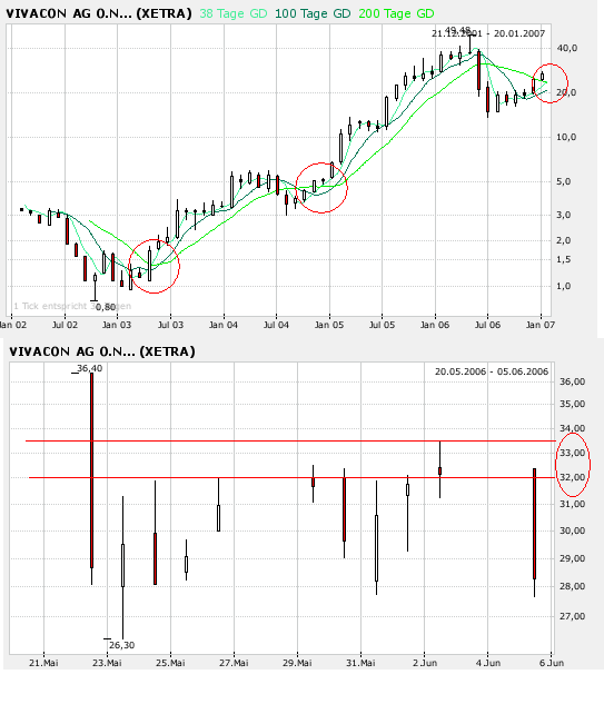 1) Zum 3. Mal in der Geschichte der VIVACON hat der GD38 den GD200 von unten durchbrochen (siehe Grafik - Ende April 2003/Ende November 2004/jetzt).