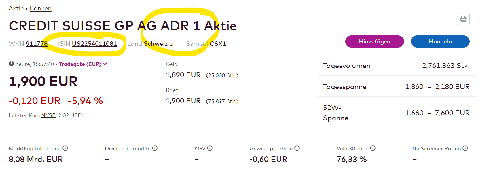 Vielleicht liegt die Verwirrung mit den Kaufkursen darin begründet, dass ich die Aktie (ISIN CH00122138530) gekauft habe und andere auf den Kurs des ADR (ISIN US2254011081) schauen? Ich habe jedenfalls nach meinem Verständnis bei Lang & Schwarz die Aktie heute zu 1,80 EUR gekauft . Siehe auch beigefügten Chartverlauf von heute. Da war der Kurs sogar im Tagestief leicht 1,794 EUR leicht unter den 1,80 EUR.
