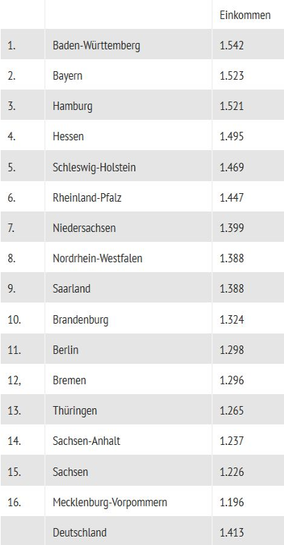 wir die Betrachtung ab, mit einem statistisch aufbereiteten, gewichteten Durchschnitts-Nettoeinkommen, nach Bundesländern, vom Institut der Deutschen Wirtschaft herausgegeben. Das bringt ein "Bürger" im Durchschnitt nach 40 Stunden Wochenarbeit, netto nach Hause.