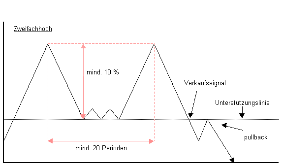 Zweifachhochs signalisieren fallende Kurse und sollten als starker Indikator einer Trendumkehr angesehen werden. Der Abstand zwischen den Hochs sollte mindestens 20 Handelstage betragen. Der erste Hochpunkt wird von starken Umsätzen begleitet. Der Kursrückgang wird meist von rückläufigen Umsätzen begleitet. Der zweite Hochpunkt bildet sich bei geringeren Umsätzen als der erste. Der folgende Kursrückgang und das Brechen der Unterstützungslinie erfolgt bei deutlich ansteigendem Umsatzvolumen.