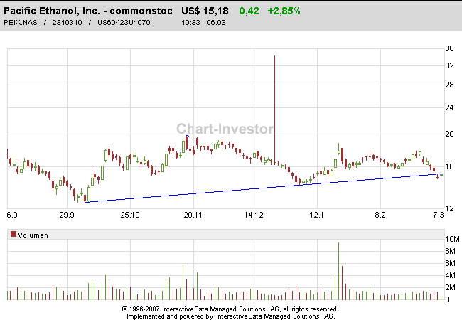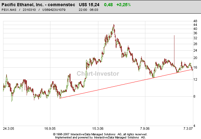 Die Folge davon: Amerikanische Ethanol-Produzenten dürften 2007 ins Blickfeld der Wall Street rücken. Das wiederum dürfte gleichbedeutend mit deutlichen Kursgewinnen solcher Titel sein.