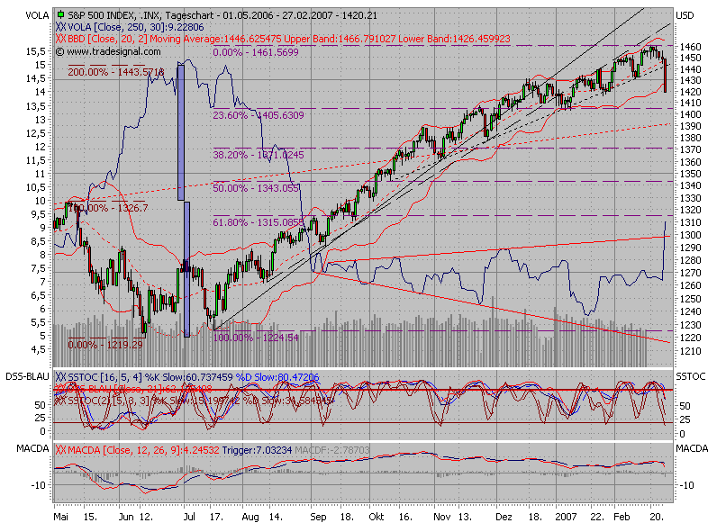 Nun, jetzt ist sie da, die von allen herbeigesehnte Korrektur. Wie eine sich selbsterfüllende Prophezeiung ist sie eingetreten. ( siehe auch angefügter Ausschnitt aus FAZ.NET v.25.02.07 ) Der Autor des Artikels konnte vor zwei Tagen noch keinen Katalysator für einen Rückschlag der Kurse ausmachen, doch nun weiß er wohl, das Katalysatoren auch in Shanghai gebaut werden.