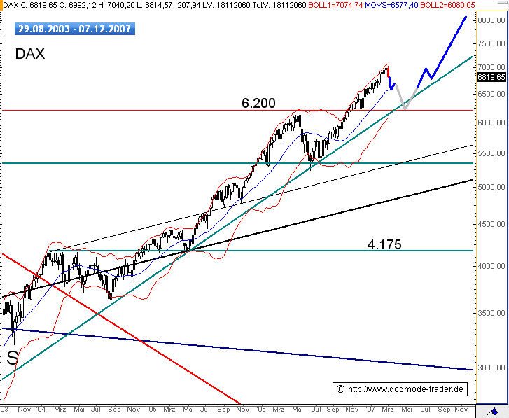 Das Dilemma der Prognoseerstellung für 2007: Anfang 2007 wiesen wir insbesondere in der Member Area darauf hin, dass wir für das Jahr 2007 lediglich Teilausblicke veröffentlichen, da eine inhomogene charttechnische Signallage vorlag und weiterhin vorliegt. Einerseits lagen intakte Aufwärtstrends und eine bullische formationstechnische Signallage vor, andererseits gab es deutlische Warnhinweise seitens der Sentimenttechnik und Marktbreiteindikatoren in den USA. Außerdem sprachen und sprechen eine Reihe zyklischer Faktoren dafür, dass sich Kursverläufe in 2007 hochvolatil abspielen könnten. Beispielsweise besagt die Zyklik, dass 07er Jahre vornehmlich ab Mitte des Jahres anfällig für umfassende Korrekturen sind. Auf n tv, im Anlegerfernsehen, auf Traders TV, etc. justierten wir im Rahmen des Aufwärtstrends im DAX die Kursziele auf 7.050 und 7.200 Punkte nach. Als maßgebliche Unterstützung wurde zuletzt das 6.920er Niveau genannt, das im Rahmen des gestrigen Intraday-SELL Offs wie warme Butter durchschlagen wurde. Mit der sich nun anbahnenden Entwicklung im DAX sehen wir uns in der Vorgehensweise bestätigt, den Kursverlauf in 2007 bisher nur in Trippelschrittchen charttechnisch kommentiert und keine Jahres-Kursziele veröffentlicht zu haben.